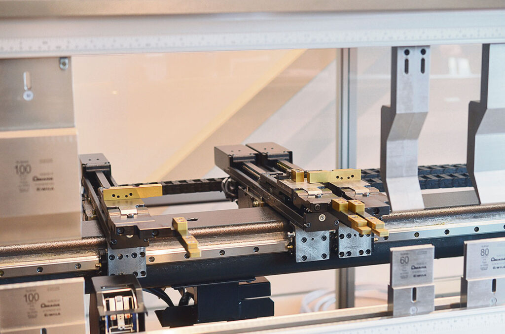 På fotos intill ser vi en nyhet AMADAs EGB-e som har ett nytt bakre anslag med tre oberoende smala fingrar. Detta möjliggör snabb och stabil positionering av detaljer, även de med komplexa former, med både främre och sidostöd.